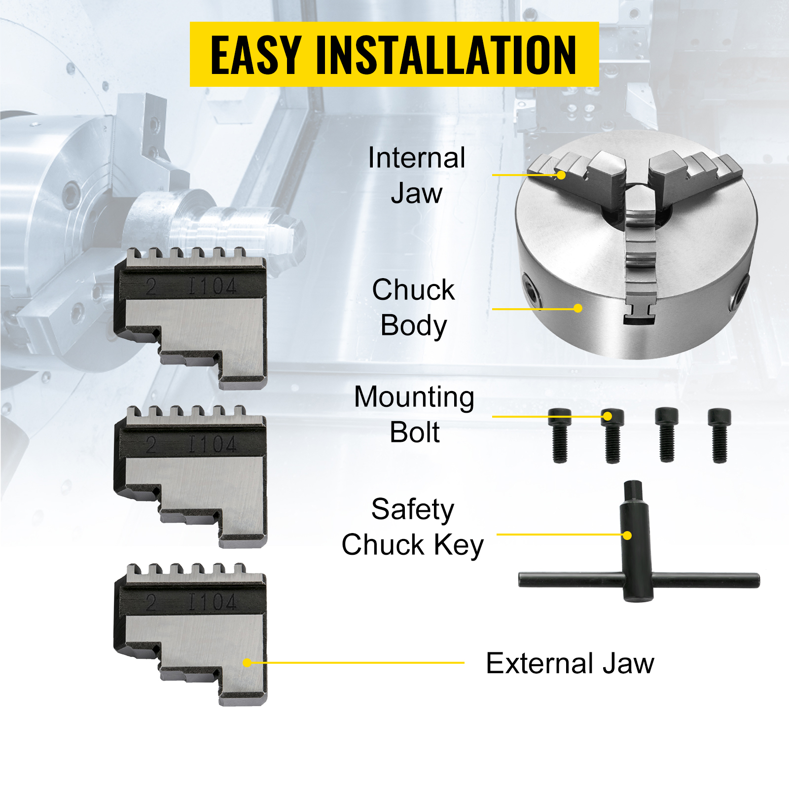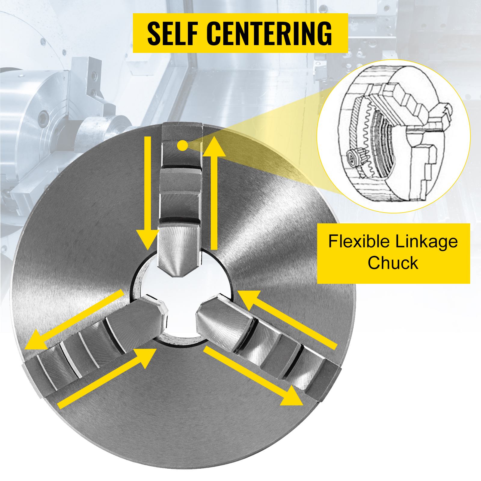 Questo versatile mandrino è realizzato in acciaio temprato di alta qualità, resistente alla compressione e ha una lunga durata. Dispone di due set di ganasce che possono contenere parti industriali nell’intervallo 0,12″/3 mm – 6,3″/160 mm. Naturalmente, questa funzione di autocentraggio del mandrino può evitare il problema di ripetute calibrazioni durante l’installazione. Questo mandrino è facile da installare e facile da usare. È adatto a tutti i tipi di torni generici, torni CNC economici, rettificatrici, fresatrici, trapani e accessori per macchine utensili.