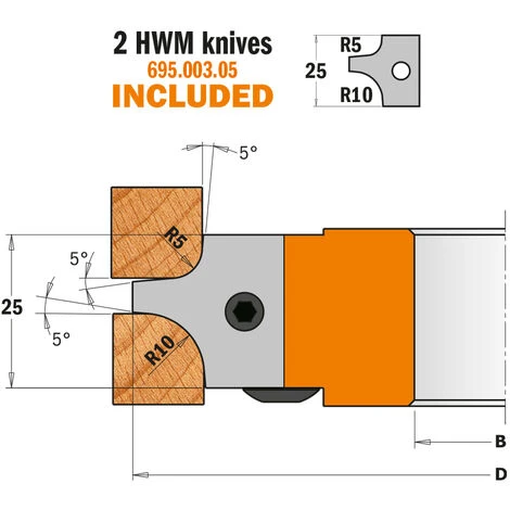 CARATTERISTICHE TECNICHE: -Corpo in lega speciale di alluminio ad elevata resistenza alla trazione e alla flessione. -2 coltelli HWM raggio 5/10mm (25×24,8x2mm) [Z2]. -Utensili per avanzamento manuale (MAN). -Spine per il posizionamento automatico dei coltelli. Vendute in una pratica e robusta confezione di plastica. Teste portacoltelli innovative che supportano tre diversi coltelli, i quali consentono di realizzare sei profili a raggio concavo. La testa portacoltelli standard viene fornita con coltelli di raggio 5 e 10mm; sono disponibili altri due set di coltelli per realizzare raggi concavi di 4 e 8mm e 3 e 6mm. Da utilizzare su macchine toupie, combinate e piallatrici. Risultato perfetto su tutti i materiali, ideale per legni duri e pannelli.