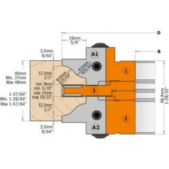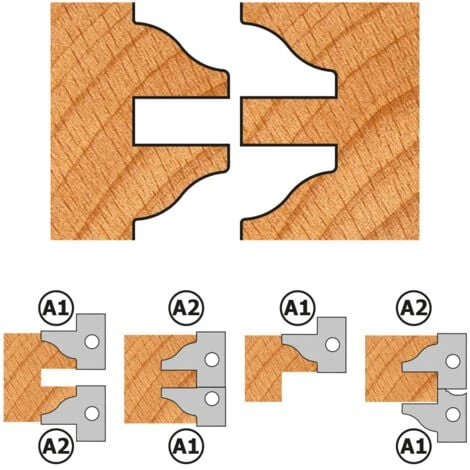 CARATTERISTICHE TECNICHE: -Corpo in lega speciale di alluminio ad elevata esistenza alla trazione e alla flessione tipo (1) e (2). -Corpo in acciaio speciale ad alta resistenza per le teste di tipo (3). -2 coltelli HWM tipo (A1) 25×29,8x2mm [Z2]. -2 coltelli HWM tipo (A2) 25×29,8x2mm [Z2]. -4 coltelli HWM 7,65x12x1,5mm [Z2]. -4 coltelli HWM 14x14x1,2mm [V4]. -12 anelli spaziatori da 0,1mm a 3 mm per le teste di tipo (1) e (2). -12 anelli spaziatori da 0,1mm a 2mm per le teste di tipo (3). -Utensili per avanzamento manuale (MAN). -Spine per il posizionamento automatico dei coltelli. Venduti in una pratica e robusta confezione di plastica. Ideato per la produzione di sportelli per mobili e porte per interni, questo set permette di montare 5 coltelli diversi per produrre i più diffusi profili classici. La fresa regolabile (inclusa) può anche essere utilizzata a parte per realizzare fresature regolabili con spessore 8-15mm. Per macchine toupie. Risultato perfetto su legni duri, teneri e pannelli con spessore massimo di 48mm.