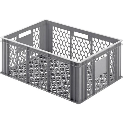 Contenitore in plastica industriale graticolato. Maniglie aperte, materiale: materiale vergine PE, colore: grigio, dimensioni interne: 570x370x235 mm, dimensioni esterne: 600x400x250 mm.