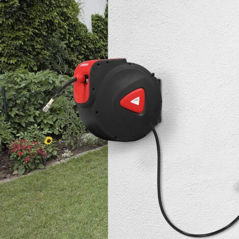Lavoro efficiente in officina, in giardino o a casa. Pratico avvolgitubo per montaggio a parete con riavvolgimento automatico.