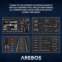 Il carrello portautensili AREBOS, stabile e ben assortito, contiene un ricco e pregiato assortimento di 81 pezzi in quattro cassetti e non dovrebbe mancare in nessun laboratorio di bricolage. Con questo carrello portautensili, non stai solo optando per un ottimo organizzatore, ma anche per un ideale ed efficiente smistamento dei tuoi utensili.