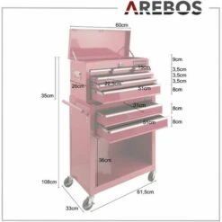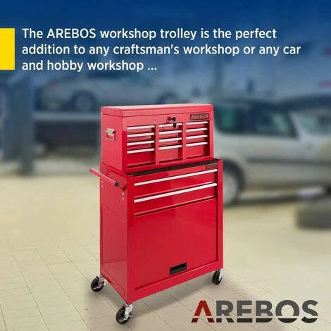 - Il nostro carrello da officina AREBOS è dotato di un totale di 8 cassetti, un cassetto pieghevole ed una capiente area di immagazzinaggio;