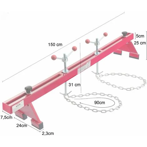 La lunghezza di circa 150 cm dell´apparecchio, permette di portare avanti anche le piú difficili riparazioni, come la rimozione o installazione del Motore, scatola del cambio oppure lavori all´asse anterione, serbatoio dell´olio ecc. Il bilanciamento durante il sollevamento viene reso possibile dal sistema di gancio con catene.