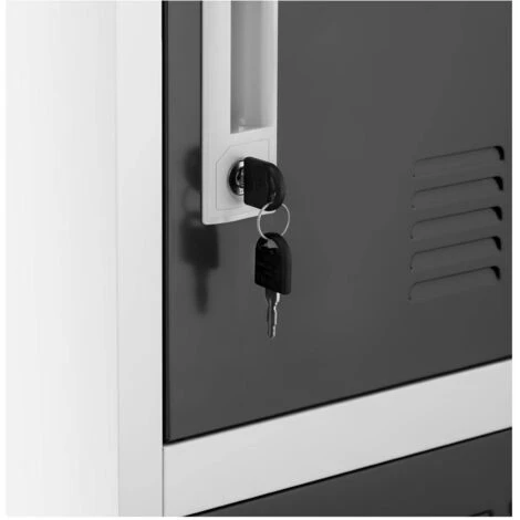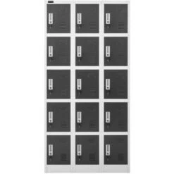Grazie alla sua solida struttura e agli scomparti con 15 serrature zincate, l’armadietto spogliatoio è un elemento d’arredo indispensabile in ogni ufficio, officina e biblioteca. I singoli scomparti misurano ciascuno 298/250 x 425 x 293 mm e possono sopportare un carico totale fino a 200 kg. Ogni armadietto è dotato di due chiavi in lega di zinco resistente per proteggere il contenuto degli scomparti da accessi non autorizzati. Pratico: grazie agli specchi e ai ganci, su ognuna delle 15 porte zincate, questo armadietto è perfetto anche come armadietto per riporre i vestiti. Inoltre, i fori di ventilazione assicurano una circolazione ottimale dell’aria.