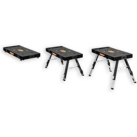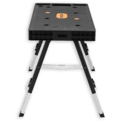Le gambe telescopiche regolabili in altezza lo rendono adatto ad ogni utilizzo. Un altro vantaggio è il piano di lavoro robusto e stabile (capacità di carico 150 kg), che viene fornito con un righello integrato (78 cm / 30 pollici) su entrambi i lati. Sul lato sinistro è integrato anche un angolo di misurazione (da 0 a 90° gradi), mentre sul lato destro c’ è la pratica possibilità di utilizzare 3 vani portaoggetti completamente integrati, per esempio per tasselli e viti. I fori corrispondenti aiutano a realizzare varie operazioni di taglio o di martellamento. Le due viti integrate sono anche utilizzate per i morsetti a vite disponibili opzionalmente, con i quali si possono facilmente fissare/agganciare tavole o simili per mezzo di un meccanismo a pompa.