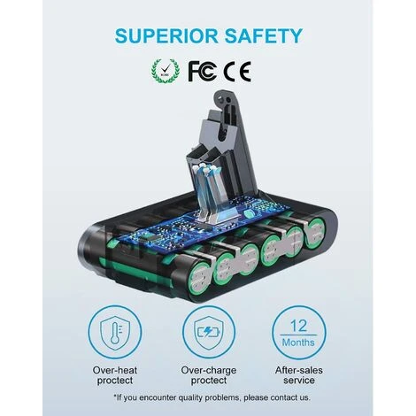 La batteria è perfetta per l’aspirapolvere Dyson V6 serie DC58 DC59 DC61 DC62 DC72 DC74, con una capacità maggiore di 3500 mAh. La batteria utilizza celle di alta qualità, senza alcun effetto memoria, progettate con tecnologia di ricarica rapida, fornendo protezione da sovraccarico e scarica profonda per prolungare la durata e protezioni da sovratensione, sovracorrente, cortocircuiti e surriscaldamento interno per garantire un utilizzo sicuro.