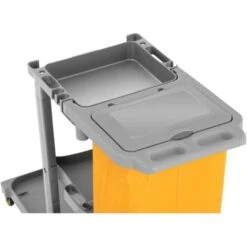 Il carrello è dotato di un grande sacco portabiancheria che può essere utilizzato anche come sacco per i rifiuti. Questo è saldamente agganciato al carrello e all’occorrenza può essere rapidamente rimosso e svuotato. Il pratico coperchio in plastica permette di avere un aspetto sempre curato e protegge gli oggetti sensibili che vengono trasportati. Un grande vantaggio: il sacco per la biancheria sporca e per la spazzatura è realizzato in materiale antistrappo, facile da pulire e impermeabile, ed è quindi adatto per trasportare anche tessuti umidi o rifiuti. Il carrello multiuso professionale offre due ulteriori pratici vantaggi: grazie all’apposito supporto il mocio può essere comodamente trasportato e lasciato asciugare. Un secondo supporto è stato pensato per avere sempre a portata di mano il segnale obbligatorio Attenzione – Pavimento scivoloso.