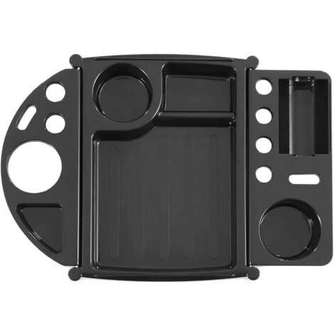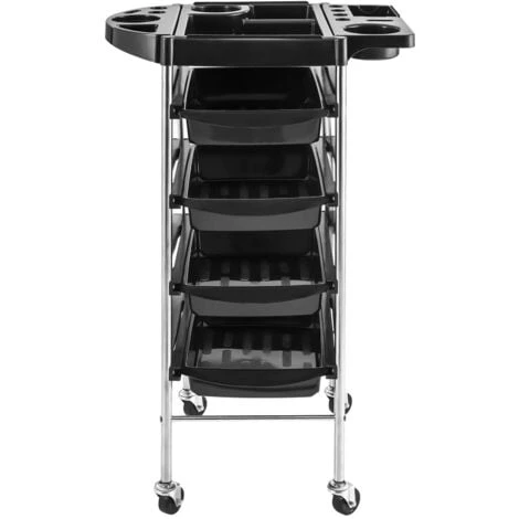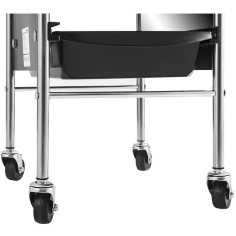 L’elegante carrello nero è stato realizzato in plastica di alta qualità, che lo rende veloce e facile da spostare. I fermi in acciaio forniscono la necessaria stabilità. Sulla parte superiore si trova una superficie d’appoggio che può essere utilizzata per riporre vari utensili da lavoro. Sulla superficie d’appoggio trovano comodamente spazio un asciugacapelli, spazzole, smalti per unghie e dispositivi per tattoo. Nel caso in cui non fossero necessarie, le parti laterali della superficie d’appoggio possono essere richiuse senza problemi. I quattro spaziosi cassetti offrono la giusta capienza per strumenti di lavoro, asciugamani o mantelle per il taglio dei capelli. Le stabili pareti laterali e le guide mantengono i cassetti nella posizione prevista. L’ampia spaziatura tra i cassetti assicura sempre f l’accessibilità del contenuto.