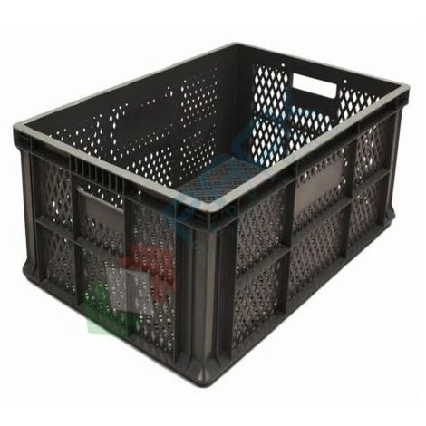 Contenitore in plastica sovrapponibile Norma Europa, capacità 65 Lt, con misura esterna: 600 L x 400 P x 330 H mm e misura interna: 569 L x 366 P x 315 H mm. La cassetta presenta base, pareti forate e maniglie passanti. Contenitore realizzato in PP (Polipropilene). Colore grigio scuro. Scatola in plastica NON idonea al contatto con alimenti.
