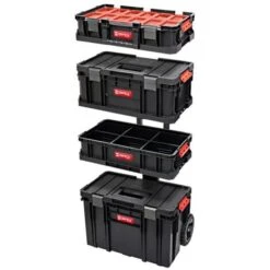 Grazie alle pareti in polipropilene duro e all’asse in metallo, questa cassetta porta attrezzi con ruote è estremamente stabile e resistente. Le due ruote grandi e l’impugnatura ergonomica garantiscono un utilizzo comodo, numerose possibilità di trasporto e un posizionamento stabile. Con una grandezza di 38x53x69 cm, la valigetta è molto spaziosa ma anche facilmente trasportabile e può essere ampliata con altre valigette Qbrick System