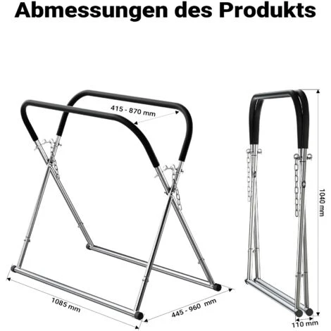 Il cavalletto misura 105 x 80 x 100 cm ed è regolabile in altezza. Le diverse altezze di lavoro possono essere regolate tra 80 e 100 cm mediante le catene.