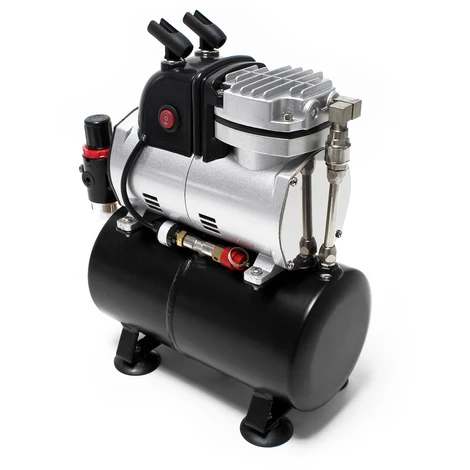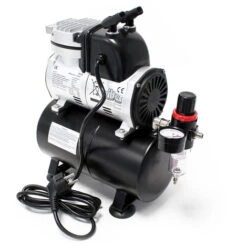 | Caratteristiche del compressore | Adatto a tutti i tipi di aerografo con ugelli da 0,2 a 1 mm, Auto Start 3 bar, Auto Stop 4 bar, Pressione di esercizio effettiva in funzionamento continuo: 0.35 – 2.5 bar, Protezione contro il surriscaldamento, Start / stop automatico |