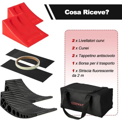Dotato di Tutti gli Accessori Necessari: Il set di livellatori per camper comprende 2 cunei, 2 livellatori, un tappetino antiscivolo, una striscia fluorescente da 2M e una borsa per il trasporto. Quando non vengono utilizzate, tutte le parti possono essere riposte nella borsa per un facile trasporto.