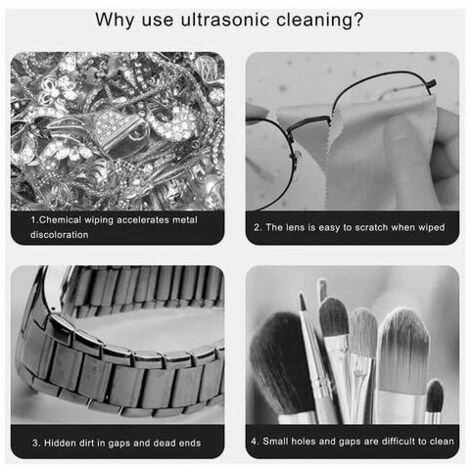 Conveniente: onda sonora ultrasonica ad alta ITequenza, è stato prodotto meno suono. Questo silenzioso pulitore ad ultrasuoni è perfetto per l’uso quotidiano come detergente per anelli, gioielli, occhiali, dentiere. Pulisce tutti i punti che non puoi raggiungere.