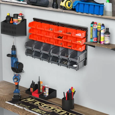 Questo contenitore portautensili da 30 pezzi vi aiuterà a tenere gli attrezzi ben organizzati e a portata di mano. È realizzato in resistente PP e ha un’impressionante capacità di carico. I contenitori in varie dimensioni possono essere rimossi e sistemati come preferite. Inoltre, i 2 pannelli a pioli possono essere montati a parete insieme o separatamente, l’ideale per locali piccoli che dispongono di poco spazio sulle pareti. Un’ottima scelta per la vostra officina, capannone o garage.