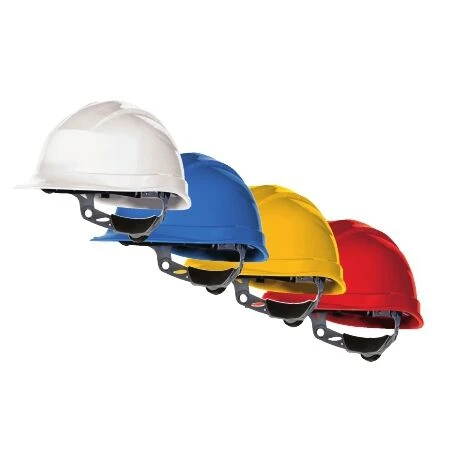 Casco da cantiere ABS. Innovativa forma stile cappellino da baseball, che consente una maggiore visione in verticale. Testato con il frontino indossato in avanti, ma anche indietro, per avere meno ingombro.