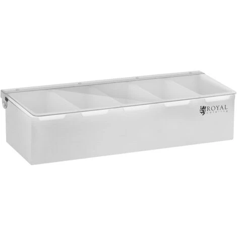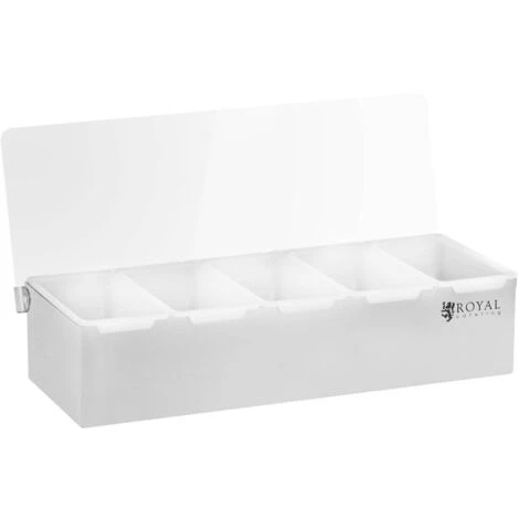 Per la preparazione professionale di pietanze, con l’espositore portacondimenti RCCBP 5 della Royal Catering siete sempre organizzati al meglio. Tutti gli ingredienti, come crudité e frutti, possono essere conservati separatamente, restando freschi a lungo e pronti per essere utilizzati nella creazione di deliziose pietanze. L’espositore portacondimenti rappresenta un’ottima soluzione per tutte le cucine professionali, che si tratti di ristoranti, bistrot, bar, fast food, stand o servizi di catering.