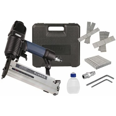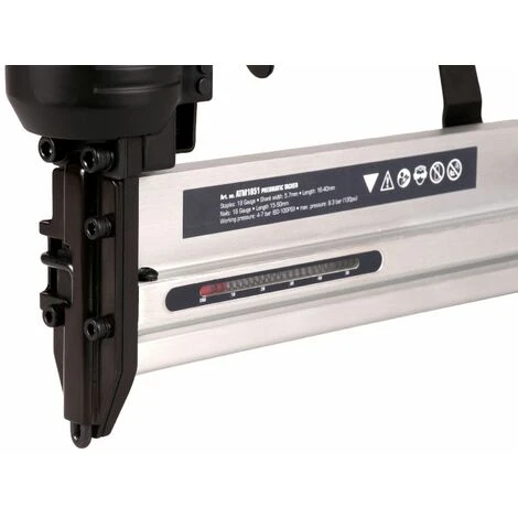 La graffatrice pneumatica ATM1051 termina il tuo lavoro in un attimo! Grazie al suo attacco DIN/Orion universale, questa potente pistola graffatrice/chiodatrice, si collega facilmente al compressore. La pressione dell’aria di questa macchina è di min 4 bar e max 7 bar.