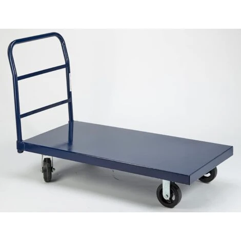 Carrello trasporto piatto Robustus portata max kg 500 prodotto in lamiera rinforzata e una sponda in acciaio. Verniciato di blu, 2 ruote fisse e 2 ruote girevoli.