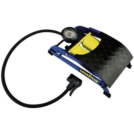 Pompa a pedale di qualità con ampio pedale. Gomma antiscivolo sul pedale per lavorare in sicurezza e comodità. Manometro con rivestimento in gomma antiurto. Doppia testa per diversi collegamenti delle valvole.