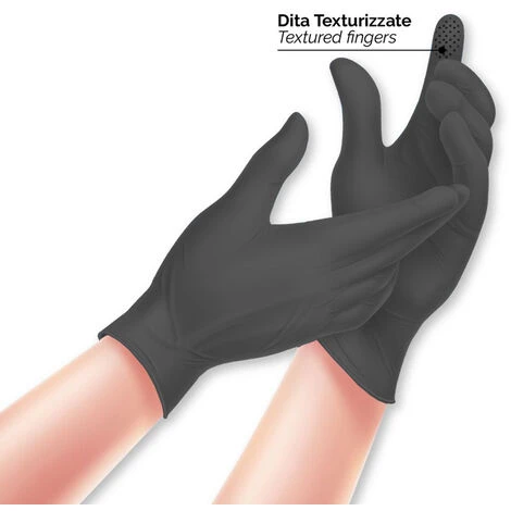 Guanto in nitrile nero, senza polvere, testurizzato sulle dita, idoneità alimentare.Senza polvereClorinatura internaColore blu cobaltoDita testurizzateForma ambidestroNon sterilePolsino salva strappoIdoneità alimentareVantaggi:Sensibilità, elevata protezione, massimo comfortTaglie / Sizes:S / 6-6,5M / 7-7,5L / 8-8,5La confezione contiene 100 pezziN.B. SELEZIONARE LA TAGLIAProdotto di qualitàLA FATTURA VIENE EMESSA PER IMPORTI SUPERIORI A 20 € E VA RICHIESTA NEL MOMENTO DELL’ ACQUISTO