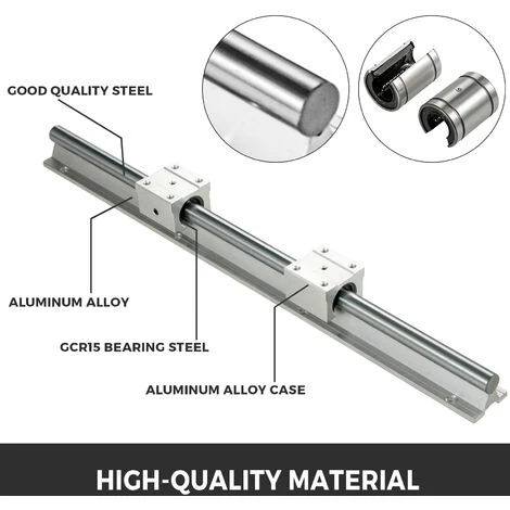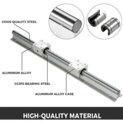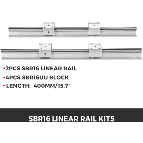 Il kit di guide lineari comprende 2 pezzi di alberi di guida SBR16 lunghi 400mm / 15,7″ e 4 blocchi SBR16UU. Resistente alla corrosione, ad alta resistenza e all’usura.
