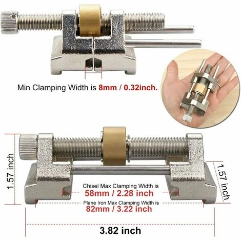 Larghezza di bloccaggio regolabile: ruotare il dado per regolare la larghezza di bloccaggio Larghezza di bloccaggio: 8~82mm Larghezza massima di bloccaggio della pialla: 82 mm. Larghezza massima di serraggio dello scalpello: 58 mm.