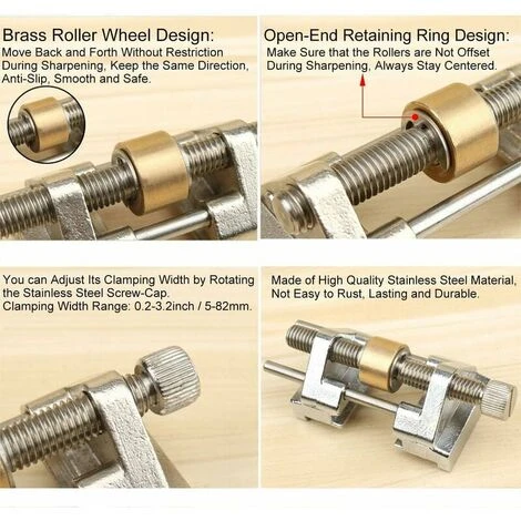 Mattarello in ottone con anello di ritenzione, estremità aperta – Design mattarello in ottone, retro e retro Senza restrizioni durante l’affilatura, mantiene un orientamento costante, antiscivolo, liscio, sicuro. Disco in ottone con anello di ritenzione, estremità aperta. Assicurarsi che i rulli non siano sfalsati durante l’affilatura della lama, dovrebbero essere sempre centrati.
