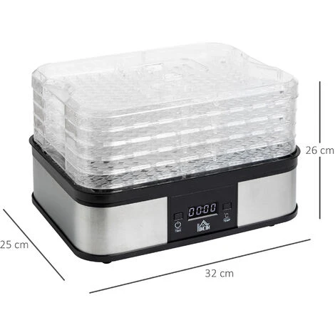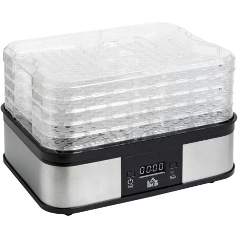 Disidrata frutta, verdura e altri alimenti in modo facile e igienico con questo essiccatore HOMCOM. Con un intervallo di temperatura regolabile tra 40 e 70℃, potrà operare tranquillamente di notte. La confezione è dotata di 5 vassoi per contenere molti alimenti separati, prevenendo la contaminazione incrociata. Il timer ti aiuterà a ottenere il giusto livello di disidratazione desiderato. Versatile e di qualità, non esitate ad acquistare questo essiccatore per alimenti.