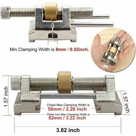 Larghezza di serraggio regolabile: possibilità di regolare la larghezza di serraggio ruotando il tappo a vite.Intervallo di larghezza di serraggio: da 8 a 82 mm. Larghezza massima di bloccaggio della pialla: 82 mm. Larghezza massima di serraggio dello scalpello: 58 mm.