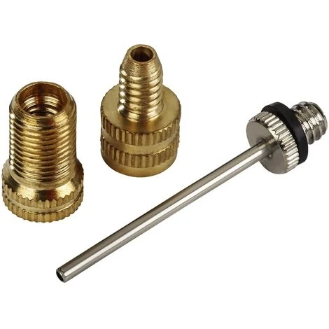 Set di 3 pezzi contenente: ,- Riduttore valvola automatica (Schrader) per adattamento su valvola Dunlop e Sclaverland,- Prolunga per valvola Dunlop e Sclaverland per adattamento su valvola automatica (Schrader),- Spillo a sfera, adatto a tutti i tipi di sfera