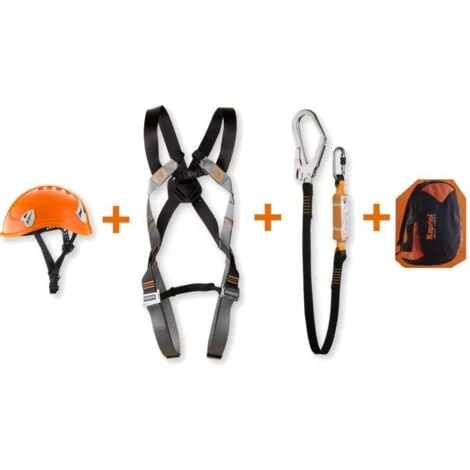 impiglio, colore arancio senza visiera, fettuccia anticaduta con un gancio con apertura mm.50 per ponteggi e tubi innocenti o altro, con dissipatore di energia e moschettone per collegarsi all imbracatura, il kit comprende anche lo zaino per riporre il tutto.