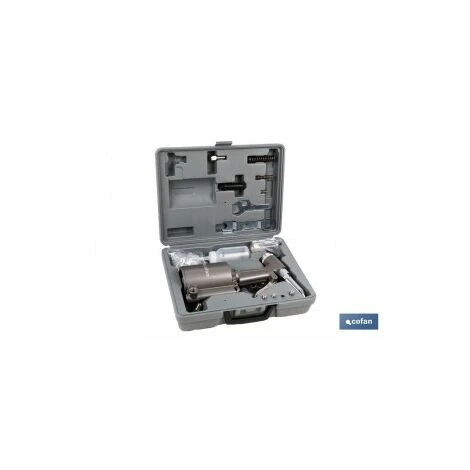 Rivettatore pneumatico in valigetta con meccanismo interno idraulico e sistema a tenuta stagna di lunga vida utile. Per rivetti da 2,4 a 5 mm. La valigetta include ugelli della mascella di ricambio dell’olio di ricambio per lo smontaggio e il kit di pulizia