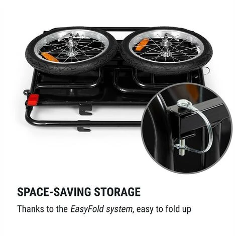Nel vano di carico da 65 litri e 42 x 65 cm del rimorchio da bici OX di Klarstein trovano spazio senza problemi i vostri bagagli, due casse di bibite, sacchi di terra per il giardino o anche tutto il vostro equipaggiamento da campeggio. Lo stabile telaio in acciaio rivestito a polveri supporta fino a ben 40 kg. Per la protezione del carico e la stabilità si trova il fondo in acciaio. Le pareti anteriore e posteriore rimovibili ampliano ulteriormente le possibilità di carico, facilitando ad esempio il trasporto di oggetti particolarmente lunghi. Un piede d’appoggio estraibile garantisce la stabilità del rimorchio monoasse. Per il massimo comfort durante il movimento, si trovano i pneumatici da 16″ x 1,75″ con sistema a innesto senza viti e il profilo Allrounder adatto a ogni tipo di superficie. Staffe in acciaio proteggono le ruote da eventuali collisioni. Per la visibilità necessaria nel traffico si trovano due catarifrangenti bianchi e due rossi. Quando il rimorchio non è in uso, basta ripiegarlo rapidamente con il sistema EasyFold e riporlo salvando spazio.