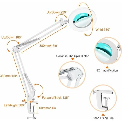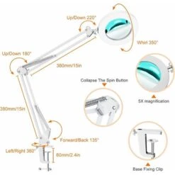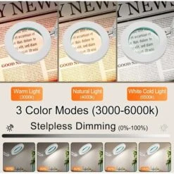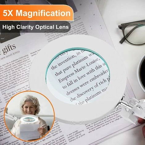 【Uscita luminosa con regolazione continua】Con una pressione prolungata del pulsante della luminosità, puoi regolare facilmente il livello di luminosità tra il 10% e il 100% per ottenere un’illuminazione perfetta e trovare facilmente l’illuminazione perfetta per il tuo progetto.3 temperature 【Ingrandimento 5X】 Questa lampada a morsetto con ingrandimento 5X e lente da 4,1″ di diametro è perfetta per leggere, ricamare a punto croce, lavorare a maglia, lavorare all’uncinetto, perline o altri hobby, in modo che gli utenti possano vedere il loro lavoro o i loro hobby facilmente e senza abbagliamento.