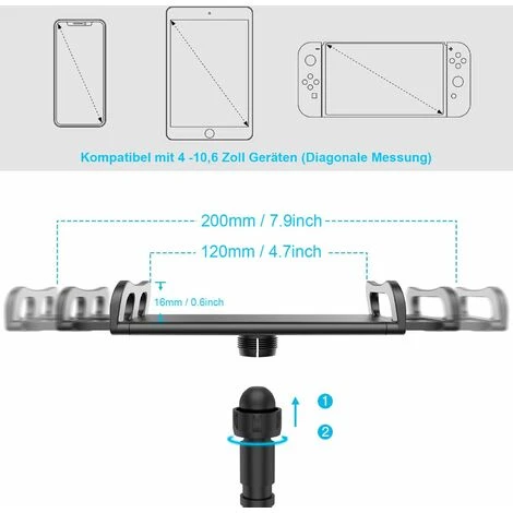 Il morsetto è adatto a diverse dimensioni del dispositivo da 4 a 11 pollici, es. iPad Air, iP ad Mini 4, iPad 4/3/2/1, iPad Pro 10.5/9.7, iPhone X/8 plus/7 plus, Fire HD 10/8/7, Huawei Mediapad M3/T3, Google Nexus 7/10, Samsung Galaxy S10/S9/S8 plus/note 8/A5/Galaxy Tab A/Tab S3, Nintendo Switch, Kindle ecc.
