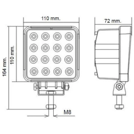 Luce di lavoro con ampio raggio d’azione (60°), rettangolare 110×110 mm, 16-LED (Epistar). Certificato: CE, IP67