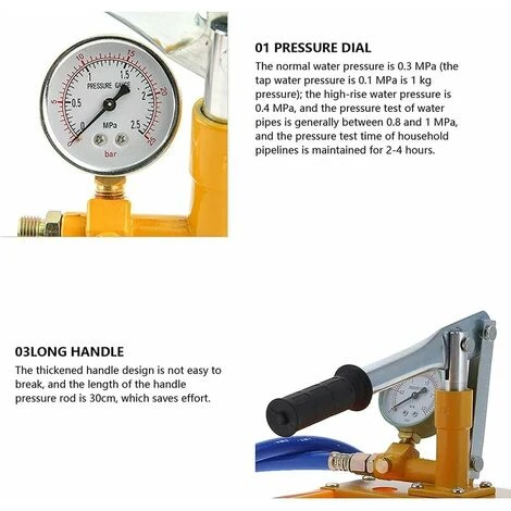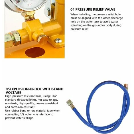 1. Collegare il tubo di scarico dell’acqua al tubo dell’acqua testato (Nota: la connessione è impermeabile). 2. Riempire il tubo testato con acqua e sgonfiare, quindi spegnere l’interruttore. 3. Riempire il serbatoio dell’acqua con acqua pulita, quindi inclinare la barra della piastra su e giù per avviare il test di pressione e la pressurizzazione.