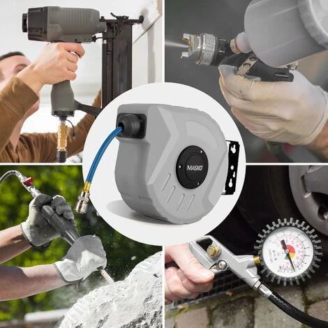 In un’officina professionale, in garage, nella stanza del bricolage, in campagna o in giardino: con l’avvolgitore per tubo automatico ad aria compressa MASKO, lavorare diventerà facilissimo. Con i nostri tubi di 10 m – 30 m di lunghezza non dovrai mai più spostare il compressore e avrai tutto sottomano per poter lavorare in modo efficiente. Grazie al supporto rimovibile da parete, l’avvolgitubo può essere facilmente montato con il kit di montaggio in dotazione e ruotato in modo flessibile di 180°. Grazie alla funzione di riavvolgimento automatico, il tubo viene arrotolato rapidamente e ordinatamente dopo l’uso. Il vantaggio del nostro avvolgitubo è che è sigillato. Grazie al design compatto, il tubo viene protetto da polvere e sporco, assicurando una durata di vita notevolmente più lunga per i tuoi tubi. Il nostro tubo si ritrae anche da solo e quindi non c’è rischio di inciampare o di ferirsi.
