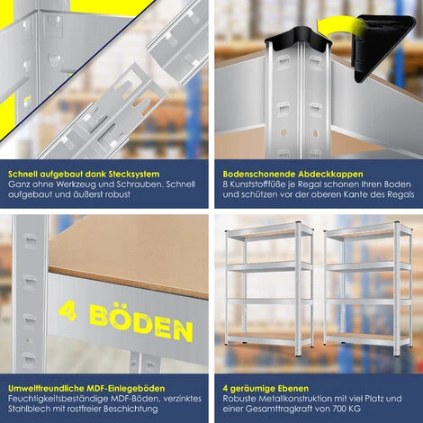La struttura senza viti consente un facile montaggio e smontaggio in pochi minuti. Questa scaffalatura per magazzino può essere smontata in modo compatto: è quindi estremamente facile da trasportare e riporre. È la soluzione ideale per conservare e organizzare gli spazi in garage, officina, magazzino, balcone e archivio. Questo scaffale senza bulloni di alta qualità è una soluzione di stoccaggio perfetta sia per uso domestico che commerciale e offre tantissimo spazio per tenere in ordine qualsiasi articolo.