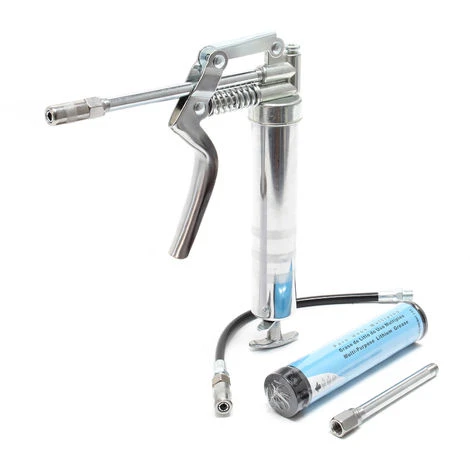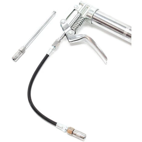 | Accessori | 2x raccordi idraulici TYPE 519/G (9,51 mm – connessione 1/8″ NPT ) adatti per ingrassatori conici secondo DIN-71412 1 x tubo dell’ugello (dritto) 145 mm 1 x tubo dell’ugello (dritto) 100 mm 1 x adattatore filettato 2x filetto interno 9,51 mm (1/8″ NPT) 1 x tubo flessibile ad alta pressione 280 mm 1 x cartuccia di grasso (120 ccm / 85 g) |