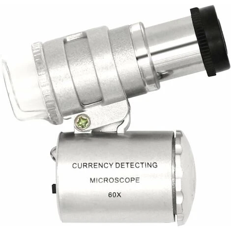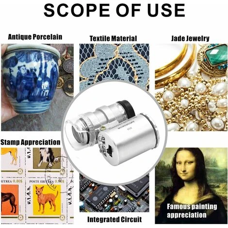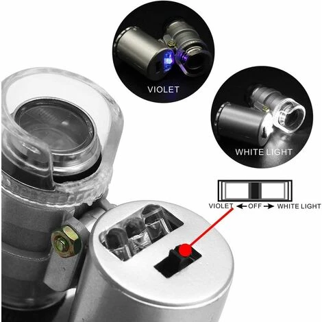 Questa mini lente d’ingrandimento 60X è realizzata in resistente plastica ABS con doppia luce LED e luce di rilevamento UV. La luce LED può aiutarti a vedere chiaramente e può essere utilizzata in luoghi bui, la luce UV per il rilevamento di valuta consente di rilevare banconote sbagliate.