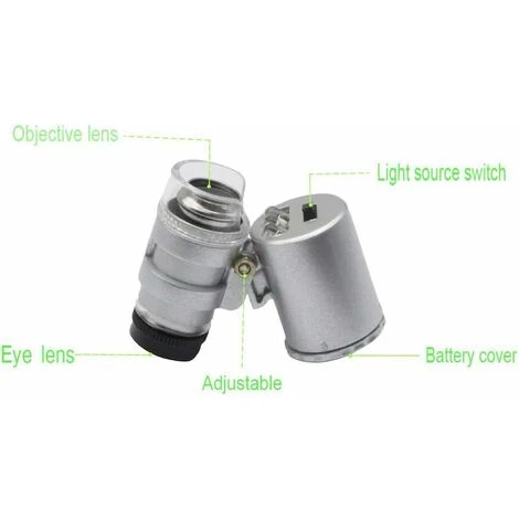 Design 2 in 1: lente d’ingrandimento 60x. Formato tascabile e super facile da trasportare, buon ingrandimento e molto positivi anche i LED! Sono molto luminosi! Anche i raggi UV funzionano bene. L’angolazione della luce LED è regolabile.
