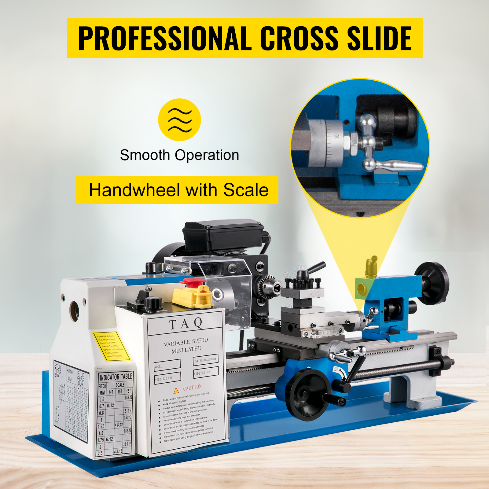 - Resto Composto Professionale: il mini palo dell’utensile a cambio rapido del tornio in metallo può ottenere posizioni di taglio interno, taglio frontale e taglio smussato modificando l’angolo del palo dell’utensile e regolando il resto del composto. La slitta a croce professionale è progettata con resistenza all’abrasione, lame mobili liberamente con asta di alimentazione.