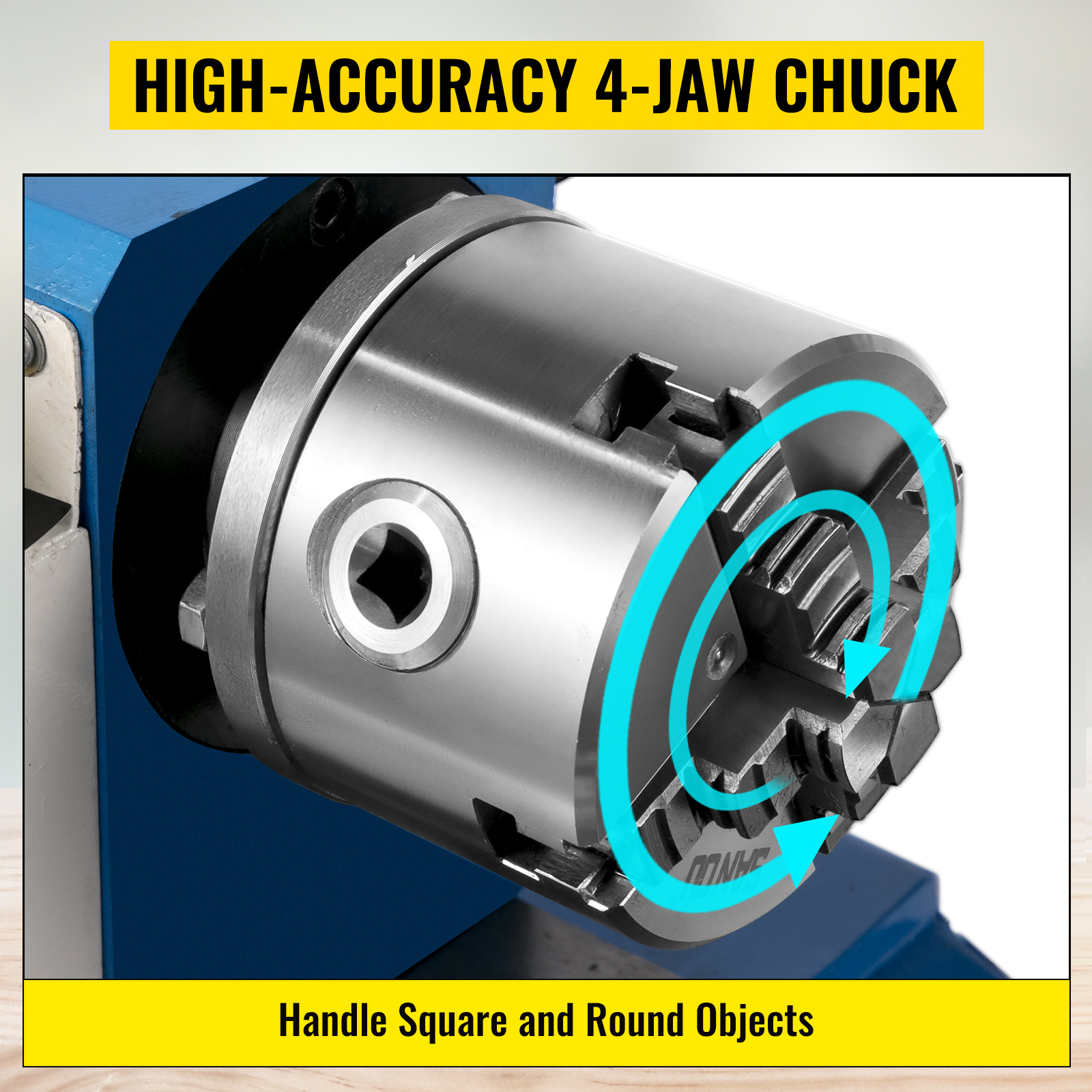 - Mandrino a 4 Griffe Preciso: mini mandrino per tornio in metallo, mandrino autocentrante a 4 griffe, per l’impostazione costante di materiali cilindrici. Paraschizzi incluso. Il mandrino è supportato da cuscinetti a rulli conici di precisione, precisione del mandrino entro 0,01 mm. Una lampada gratuita è inclusa. Diametro mandrino: 3,15″/80 mm.