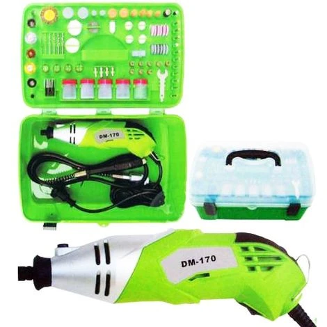 Kit composto da minitrapano ad alta precisione con potenza di 170 Watt che raggiunge da 8000 – 35000 giri/minuto. Dotato di 218 accessori per taglio / incisione / pulizia / lucidatura e levigatura. Il tutto racchiuso in una comoda cassetta di plastica. Incluso nel kit troverete supporto da banco e una comoda prolunga flessibile che vi permettera’ di svolgere lavori di massima precisione.