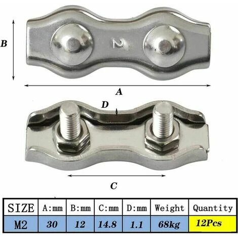 Fascetta fermacavo in acciaio inox La fascetta doppia M2 viene utilizzata per realizzare un anello sul cavo d’acciaio. Si compone di una base con viti e dadi. Ha alte prestazioni ed è ampiamente utilizzato.,Materiale durevole: la flangia in acciaio inossidabile è realizzata in acciaio inossidabile 304 di alta qualità, spesso e resistente, non arrugginisce mai, resiste agli acidi e alla corrosione, ha una forte capacità portante e può essere utilizzata per molto tempo Ottima fattura: la filettatura della fascetta ha un’elevata precisione e non causerà lo slittamento.La vite a doppio palo lo rende più forte e più stabile, eliminando i rischi nascosti per la sicurezza durante l’uso. i fermacavi possono essere utilizzati per cavi in acciaio da 1,5 mm; I morsetti duplex possono essere utilizzati per fissare funi, fili d’acciaio, stendibiancheria, ecc. Specifiche del prodotto: morsetti a coppia intrecciata M2, lunghi 3 cm e spessi 0,1 cm. È facile da usare e adatto per SWR da 1 mm a 1,5 mm. Il morsetto a doppino intrecciato è necessario per rigging pesanti e cavi collegati. Colore: argento Fornitura: 12 pezzi