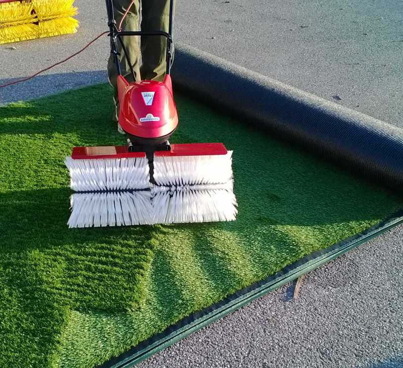 Foto che illustra come la Sandy raddrizza il pelo di un prato sintetico appena srotolato.