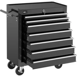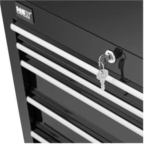 I sette scomparti di 51 x 28 cm, di cui due altri 4 cm e cinque alti 8,5 cm hanno una portata fino a 5 kg ciascuno. Poiché il ripiano superiore e il piano di lavoro possono reggere altri 25 kg, il carico totale di questa cassettiera da officina ammonta a ben 60 kg. I tappetini in silicone, applicati con precisione all’interno degli scomparti e sul ripiano di 61 x 32,5 cm, riducono enormemente il livello di rumorosità, prevengono graffi sulla superficie e proteggono gli utensili.
